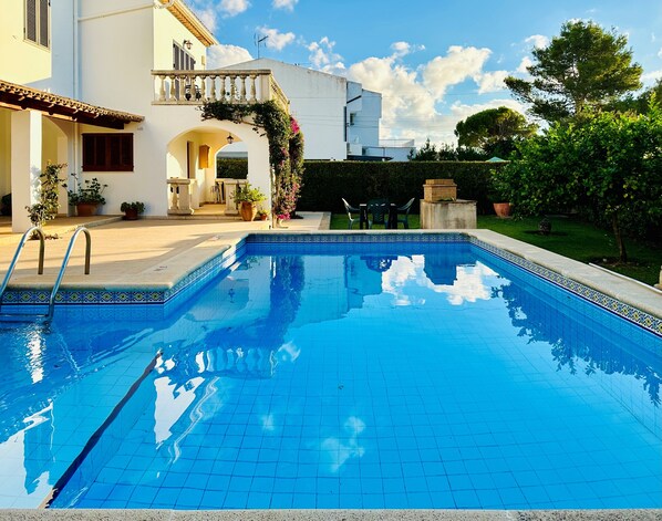 This a great villa! Spacious, airconditioned lounge/dining room with plenty of seating and huge doors which can be opened to the garden. The master ensuite is large and comfortable with balcony and all bedrooms have aircon too. The kitchen is functional, although a little dark, but has everything u need while on holiday including a filtered tap for drinking water. Outside space is exactly what we needed for our group of 7 (4 adults and 3 children aged 10, 10 and 17). Yes, the sun loungers could do with an upgrade but we just tightened the cords and they were fine and comfortable. The pool is a great size, even when we were all in it! 1.4m at the steps and then 1.6m sloping to 2.4m so jumping in and even shallow diving was possible. Outdoor cooking and dining space is plentiful, with brick BBQ and another smaller freestanding option - seating for 8 around the large table and a second smaller table. Location was perfect for us, with the local mini-mart only a 2min walk which we used for fresh bread and croissants each morning. Larger supermarket less than 10 min walk down the main road for a wider range and your "big shop". The closet beach is about 12-15 min walk which we used for paddle boarding and you can walk to the northern beaches of Puerto Pollenca in about 30mins if u wish. We'd definitely go back - Thanks Roger!!