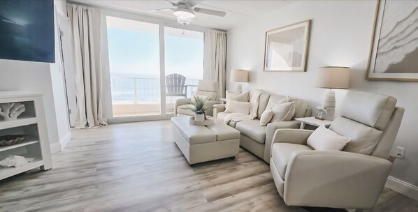 The unit sleeps 7. The condo is a 2 Bedroom / 2 Bath accommodation. The primary bedroom has a brand-new king bed with premium bedding and linens. The second bedroom is equipped with brand new full and twin beds. All furniture, mattresses and linens are brand-new. The living room couch pulls out to a Full Sleeper. The furnishings are all brand new and tastefully decorated with a serene beach feel. Full size washer/dryer in unit, along with beach chairs and towels to use! Clean and crisp, this coastal condo is fully equipped and ready for you to enjoy!