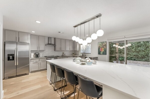 The home features a spacious open layout with multiple living areas, allowing guests to relax, gather, and unwind comfortably. The fully equipped kitchen includes modern appliances and ample space for cooking and dining at home. High speed Wi Fi, smart TVs, and an in home washer and dryer make the home especially well suited for longer stays.