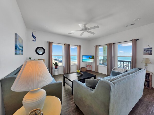Sea Mist is a great home with 2 bedrooms and 2 bathrooms that sleeps 6. The open-concept living room/kitchen area provides space for you and your guests to gather. The living room has comfortable seating for everyone to enjoy watching their favorite movies or shows on the Smart TVs. Just enter the login and password information provided for the WIFI. The kitchen is equipped with the necessities needed to make meal prepping easy. The primary bedroom has a king-size bed and an attached bathroom with a shower/tub combo. Bedroom two has a queen-size bed and an attached bathroom with a shower/tub combo. There are also two Twin-size Air Beds with automatic inflation, on a frame, stored in a closet. The instructions for assembly are attached. The real showstopper will be the views from the deck of our glorious sunrises and breathtaking sunsets! Enjoy lounging here with your favorite beverage, taking in the beautiful sights. When an outing on the beach calls, you are just steps away. After a fun day in the sand and sun, rinse away everything except your memories in the outdoor shower.