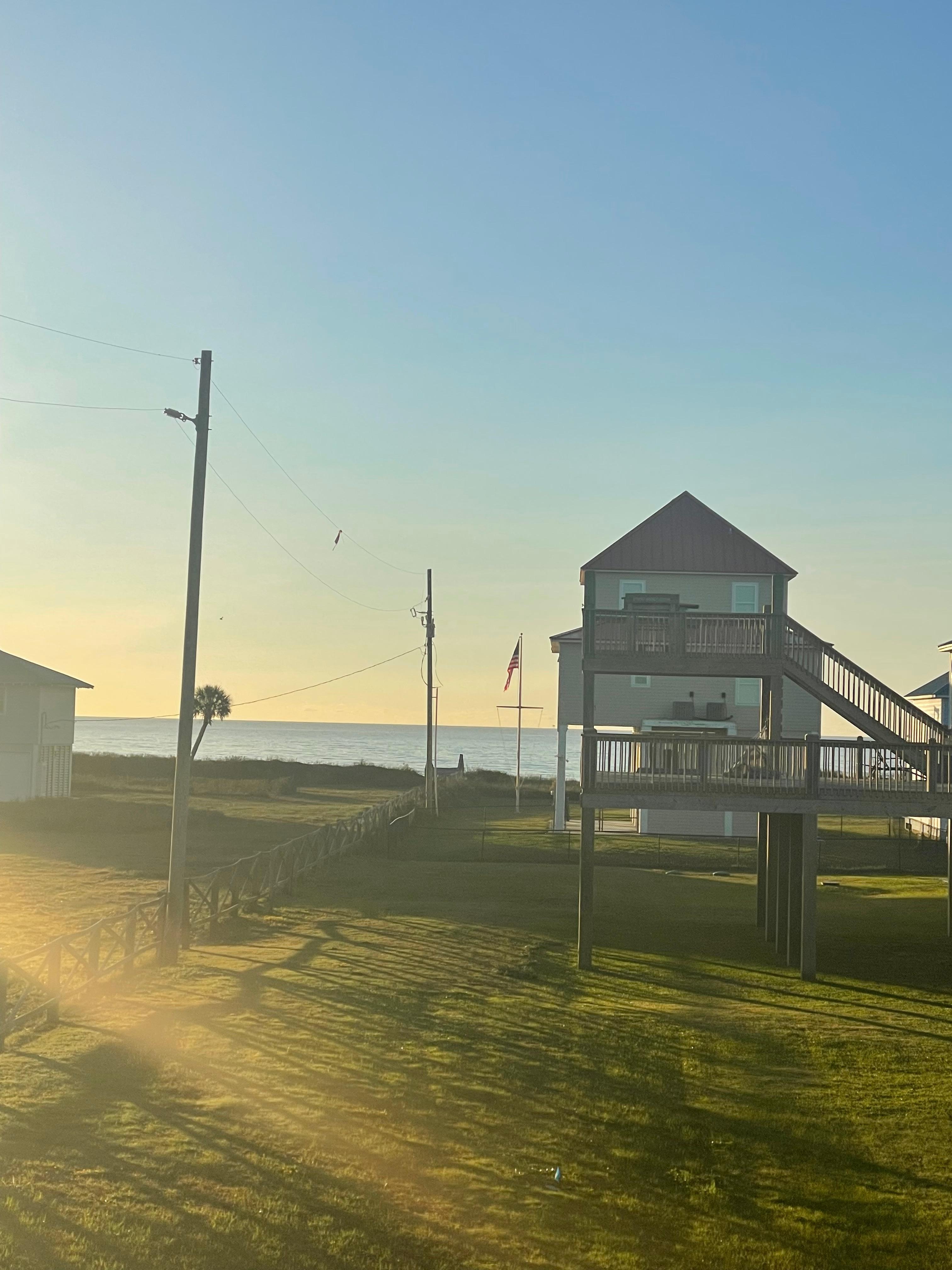 Relaxing views of the breathtaking sunrises, sunsets and sound of the waves from the large deck. Looking for the perfect vacation? Come stay with us in this spacious 3 bedroom/2 bathroom beach cabin and enjoy the benefits of a quiet, private entry, family friendly beach just steps away AND the amazing wildlife the Audubon Preserve provides. 1 King bedroom, 1 Queen bedroom, 2 Bunk full over full plus, 1 Queen bed in bunk room (sleeps 8 total), 2 full bathrooms + sand shower downstairs, Smart TVs in every bedroom plus living room, Full kitchen Wifi, Downstairs BBQ & Outdoor Sink, Best beachcombing spot on Bolivar
