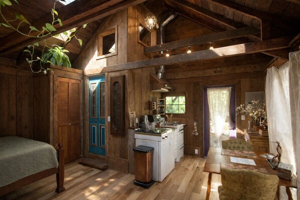 Very easy access to the Magic Barn. Was surprised to find that a “hot tub” meant a bathtub with running hot water. Lock on the sliding door stopped working when trying to lock from the outside. Cobwebs hanging off ceiling and plants everywhere!But otherwise cozy, close to grocery and thrift stores. On a VERY busy street but when I closed my eyes the noise sounded more like wind than traffic.