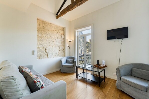 L'appartement est décloisonné. Le salon est équipé d'un canapé confortable, d'une télévision avec accès à plusieurs services de streaming pour profiter de vos émissions préférées, d'un bureau parfait pour travailler ou étudier, et d'un coin repas avec trois places assises.