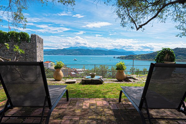 La grande terrasse de jardin isolée offre une vue mémorable sur la mer, qui comprend l'île de Palmaria, le golfe de La Spezia et les Alpes Apuanes. La terrasse est un espace fantastique pour bronzer, manger et se divertir et est équipée d'une table, de chaises, de deux chaises longues et d'un barbecue.