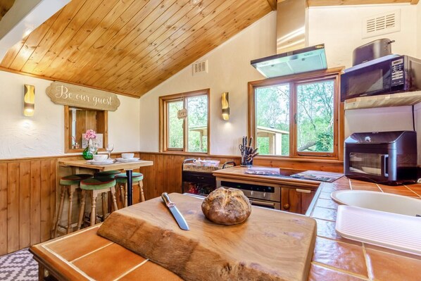 This magical cabin sits on the grounds of the owner’s home, yet privacy is assured in its undisturbed location. Open-plan living awaits when you step inside, with a lovely lounge, kitchen, and dining area neatly positioned beneath elegant wooden beams. Gaze out into the trees while preparing dishes in the kitchen, sit at the high table to dine, and relax on the cosy sofa and armchairs when it’s time to unwind. A wood burner and a Smart TV complete this cosy area for relaxing evenings indoors. Just off this space, a handy utility room offers versatility for those with pets, providing a space to clean muddy paws and laundry facilities. You’ll also find a king-size bedroom on this floor, along with a refreshing shower room. The bedroom is utterly inviting, with plenty of space and storage, along with an additional TV.