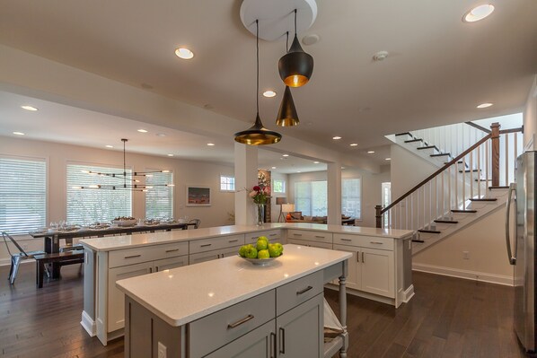 We loved this beautiful home that had plenty of space to spread out and to congregate as we wished. Kitchen was well equipped with an abundance of cookware and serving ware. The house was beautifully and comfortably furnished. The beach was a close drive away, as were shops and restaurants, though we wished more was walkable. The one draw back was that the house’s AC had just one zone, located on the main floor. To cool down the upstairs to a comfortable temp meant the basement bedroom was literally frigid, which meant no one was really comfortable at night-someone was either too hot or too cold.