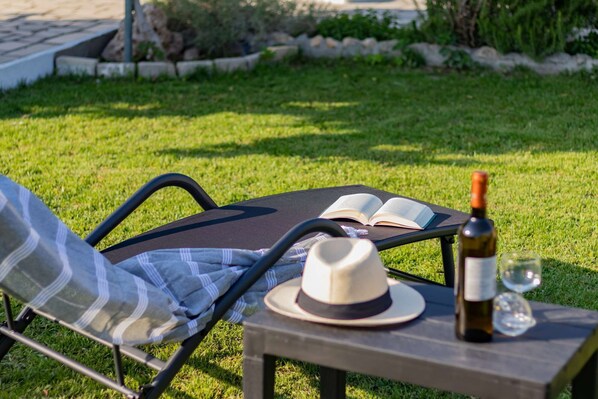 Step outside to discover the apartment’s charming outdoor area. Surrounded by lush greenery, the garden provides a peaceful retreat where you can bask in the sun or enjoy the cool sea breeze. Comfortable outdoor furniture is available, making it an ideal spot for morning coffee, afternoon lounging, or evening drinks under the stars.
