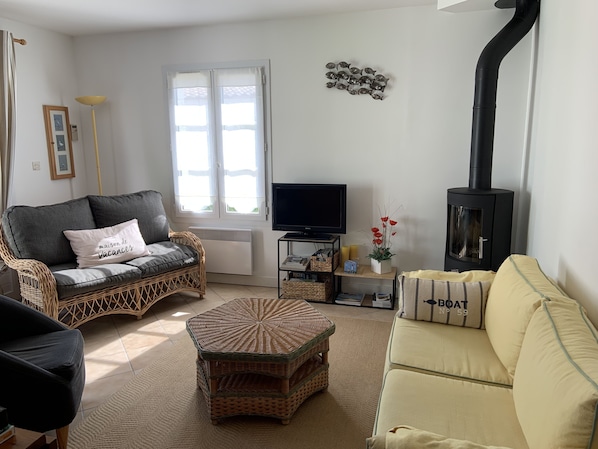 - au rez de chaussée: un salon séjour et cuisine équipée, wc.Donnant sur la cour, une chambre indépendante avec convertible 140, salle de bain avec douche et, le cellier.