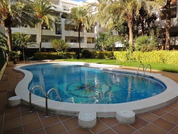 L’appartement est au 2ème étage avec ascenseur dans une résidence de vacances sécurisée avec piscine plus bassin pour enfants et son jardin exotique. Il a une chambre avec lit double, canapé convertible 2 places, salle de bains avec baignoire et lave linge, cuisine équipée (four, micro onde, frigo, machine à café, etc), Salon avec TV (TNT Française et Espagnole), climatisation réversible dans le salon ainsi que la chambre et chauffage au sol, terrasse avec mobilier de jardin, vue sur la Marina et parking devant la résidence.