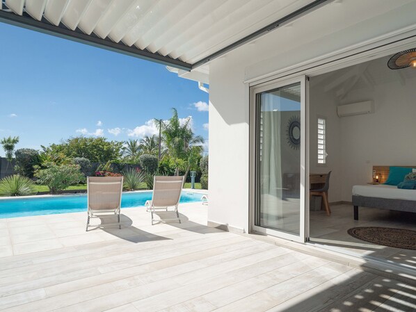 Proche plage et commerce. Grand jardin arboré entourant la piscine. La troisième chambre est équipée d'un coin kitchenette avec une petite terrasse.