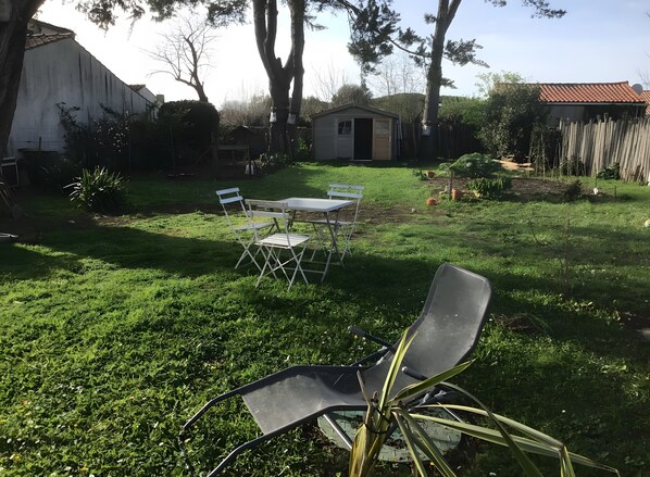 La terrasse couverte privée de 20 m², aménagée avec mobilier de jardin, est idéale pour vos repas en plein air et vos moments de détente. Le jardin commun vous offre un espace extérieur supplémentaire pour vous relaxer durant votre séjour, ainsi que des transats. Il est autorisé de pique-niquer dans le jardin.
