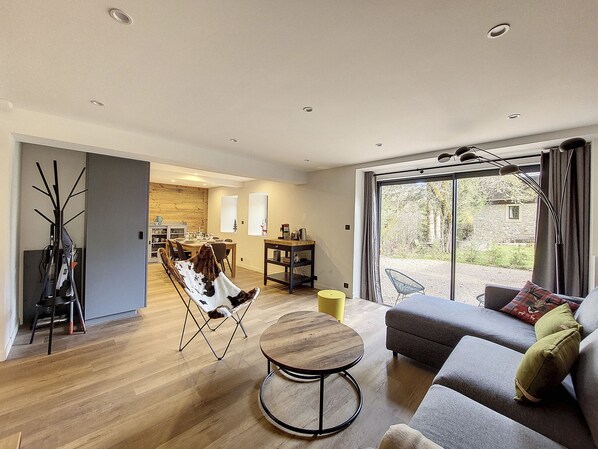 Un salon spacieux et lumineux avec TV, canapé convertible.