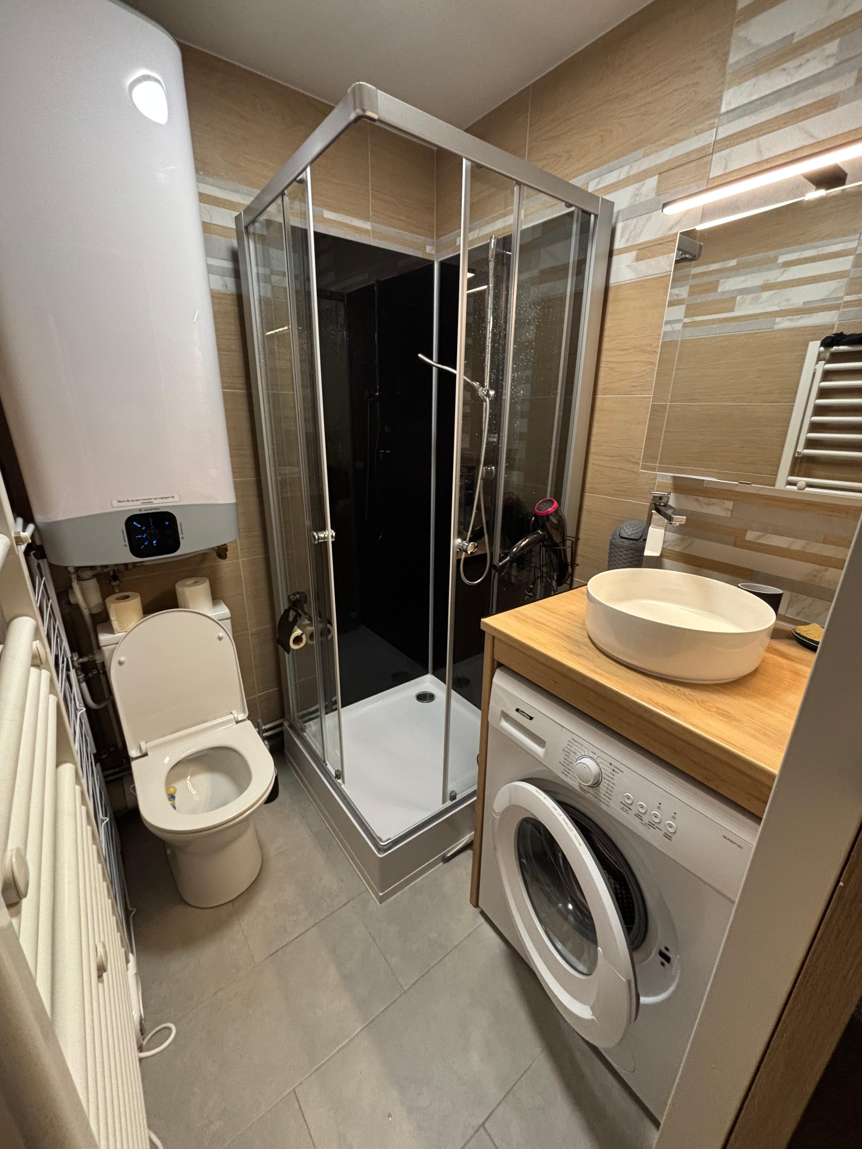 Une salle de bain avec douche, WC, machine à laver le linge et sèche cheveux.
