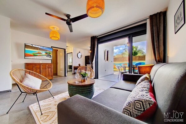 L’entrée dans l’appartement se fait par un spacieux salon climatisé, équipé d’une smart TV XXL et d’un canapé-lit de marque italienne en 160x200cm. Le mobilier venu d’Inde apporte un cachet et une authenticité à ce joli logement. Dans un placard de l’entrée, une machine à laver séchante apportera un vrai bonus à votre séjour.