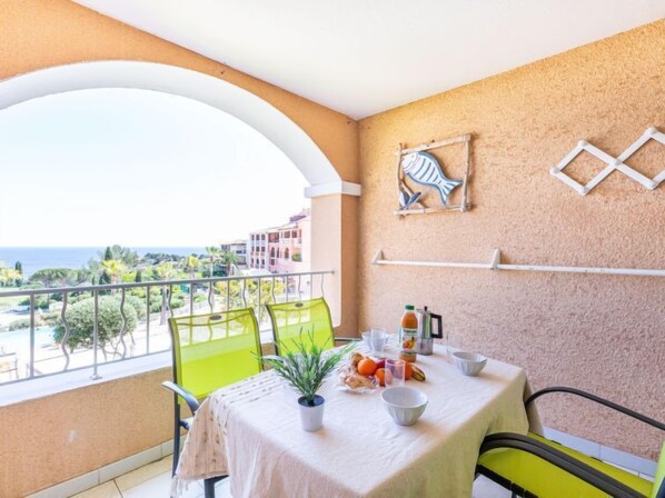 "Le Village (E1 214)", apt 2 pièces 28 m2 au 1er étage. Séjour avec 1 lit gigogne (2 x 80 cm, longueur 190 cm), TV. Sortie sur la terrasse. 1 chambre avec 1 grand-lit (140 cm, longueur 190 cm). Coin cuisine (4 plaques de cuisson, mini-four, lave-vaisselle, grille-pain, bouilloire électrique, cafetière électrique). Salle de bains, WC séparé. Chauffage électrique. Terrasse 9 m2, couverte. Meubles de terrasse. Vue sur la mer et la piscine. A disposition: Internet (Connexion WIFI, en sus). Place de parking (1 Voiture). Veuillez noter: logement non-fumeur. 1 animal/ chien de petite taille autorisé. Détecteur de fumée. Annonce d'un particulier (art 155, IV du CGI).