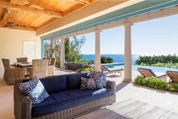 -    Large lounge with doors leading to sea-view terrace