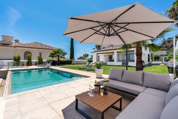 Des baies vitrées dans le salon donnent mène à la terrasse couverte, le jardin et la piscine privée climatisée. Cette terrasse est équipée d’un barbecue fixe de brique et autre au gaz, ainsi qu’une table avec espace pour huit personnes ou vous pouvez manger à l’air libre ou prendre le petit-déjeuner tout en admirant les belles vues matinales. L’accès au jardin et à la piscine de débordement est aussi adapté pour les personnes en fauteuil roulant. La piscine d’eau salée mesure 9m x 5m avec une profondeur maximale de 180-220cm. La piscine est équipée d’un palier à 130cm de profondeur ou les gens de mobilité réduite peuvent s’asseoir avant de se lancer dans la partie plus profonde.