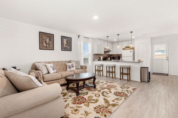 If you are going to stay for BMT this place was perfect. I would recommend 6 adults and maybe 2 small kids. Location was super close to everything. Only about 10 minutes to base. Easy to access and easy to get in and out. It is brand new and in a safe area. Beds were very comfortable. EVERYTHING VERY CLEAN. Kitchen had everything you needed to cook(except a cookie sheet but pizza pan made do). Kitchen utensils and pans were high quality and worked great since we cooked many meals at home. Back was fenced in and private and we enjoyed the artificial turf. Great back yard. We played lots of corn hole. Only 2 negatives that were not a big deal- They only provided 5 towels and no wash cloths. The projector tv was to big for the room and weird set up when you got up it blocked the projection because it was on a table by the couch. A regular TV would be perfect. I would recommend to take the one out of the bedroom and put it there instead. The owner was very responsive and gave a lot of great tips. If you need a clean and comfortable place to stay close to base and close to most places in San Antonio then I would highly recommend this place. It was a very nice set up and worked perfectly for our family. Thanks for allowing us to use your home!