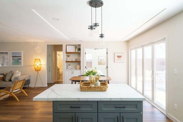 Cook up meals for the group in the modern, chef-friendly kitchen that comes fully equipped with high-end appliances and all the cookware, dinnerware, and utensils you could need. On a sunny day, open the glass doors to create a seamless indoor/outdoor space as you eat at the dining table or at the sleek breakfast bar and take in the cool ocean breeze. There are two beautiful bedrooms within the home, with each offering large queen beds, bedside tables with reading lamps, and plenty of space for you to unpack and make yourself at home.