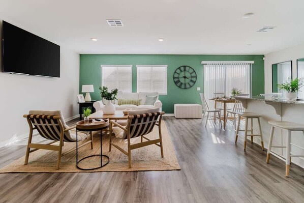 Stay comfortable year-round with central air conditioning and heating. Two large Smart TVs (65" and 70") provide entertainment options, while high-speed Wi-Fi keeps you connected. A dedicated workspace makes remote work a breeze, and the laundry room with a washer and dryer ensures your stay is stress-free.