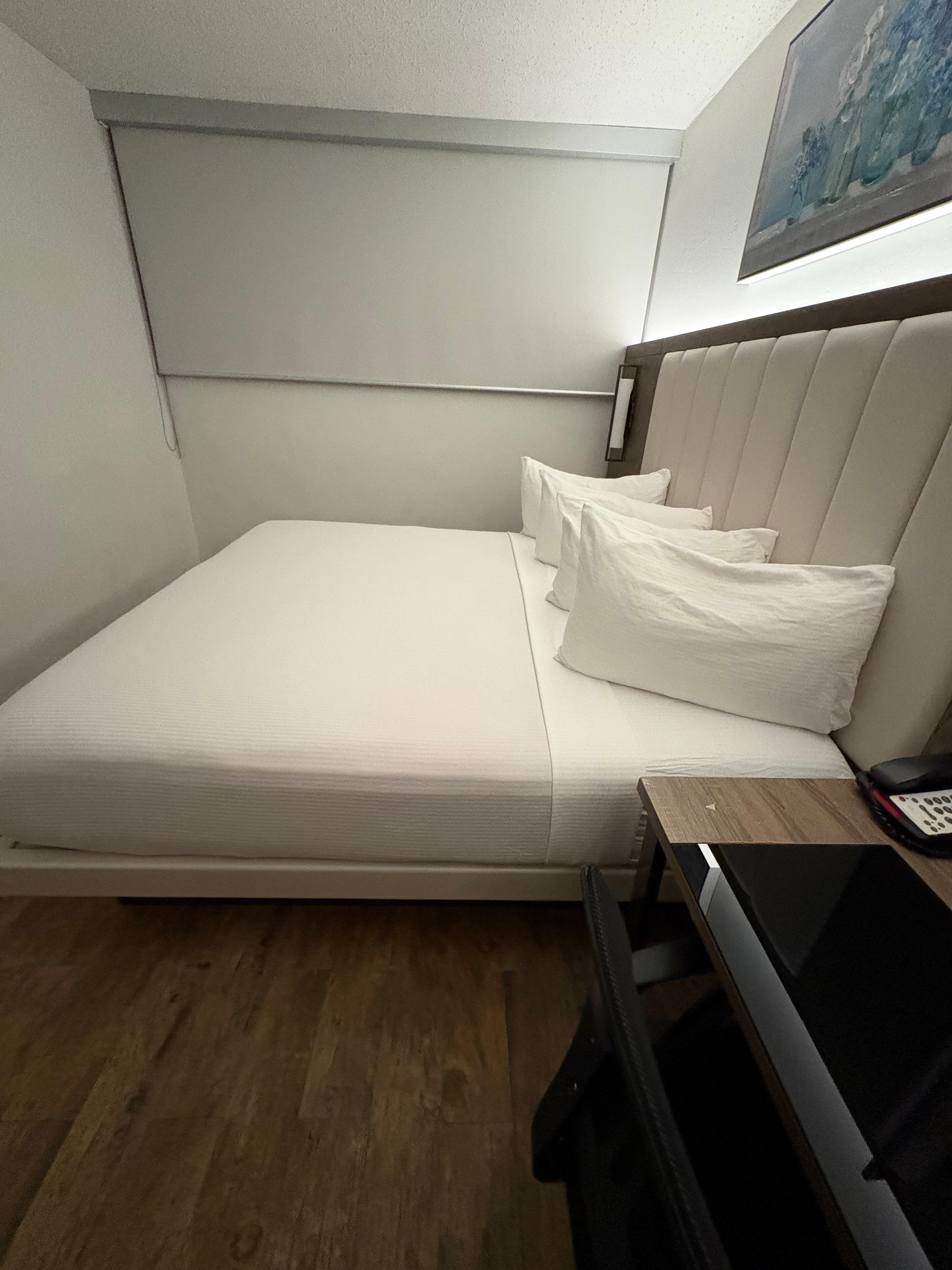 Basically, a bed with a sheet and a light blanket. It was clean room, the rooms are not soundproof, walking down the hall you can hear people in their rooms talking. light shines in under the door, it is a convenient location if you are departing early am, you can walk to the terminal, and that is the only thing it has going for it.
