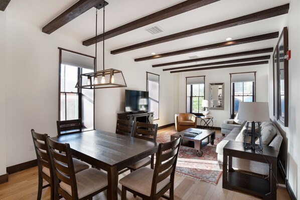 Great condo. Very convenient - walked to 3 Out of the 5 restaurants. Easy to leave and go hiking. Two day trips : Taos and Los Alamos. We were able to shop together and then split up because the condo was so convenient. Very well appointed. Only slight issue - lots of stairs (which we knew about). Also, parking was in a surface lot managed by the city. It worked out fine but it tended to fill up so we had to hunt for spaces a couple of times. Also - weekend “cruisers” ie loud cars and motorcycles disrupted sleep. Brought our own sound machine plus their app on the TVs. Would rent this unit again.