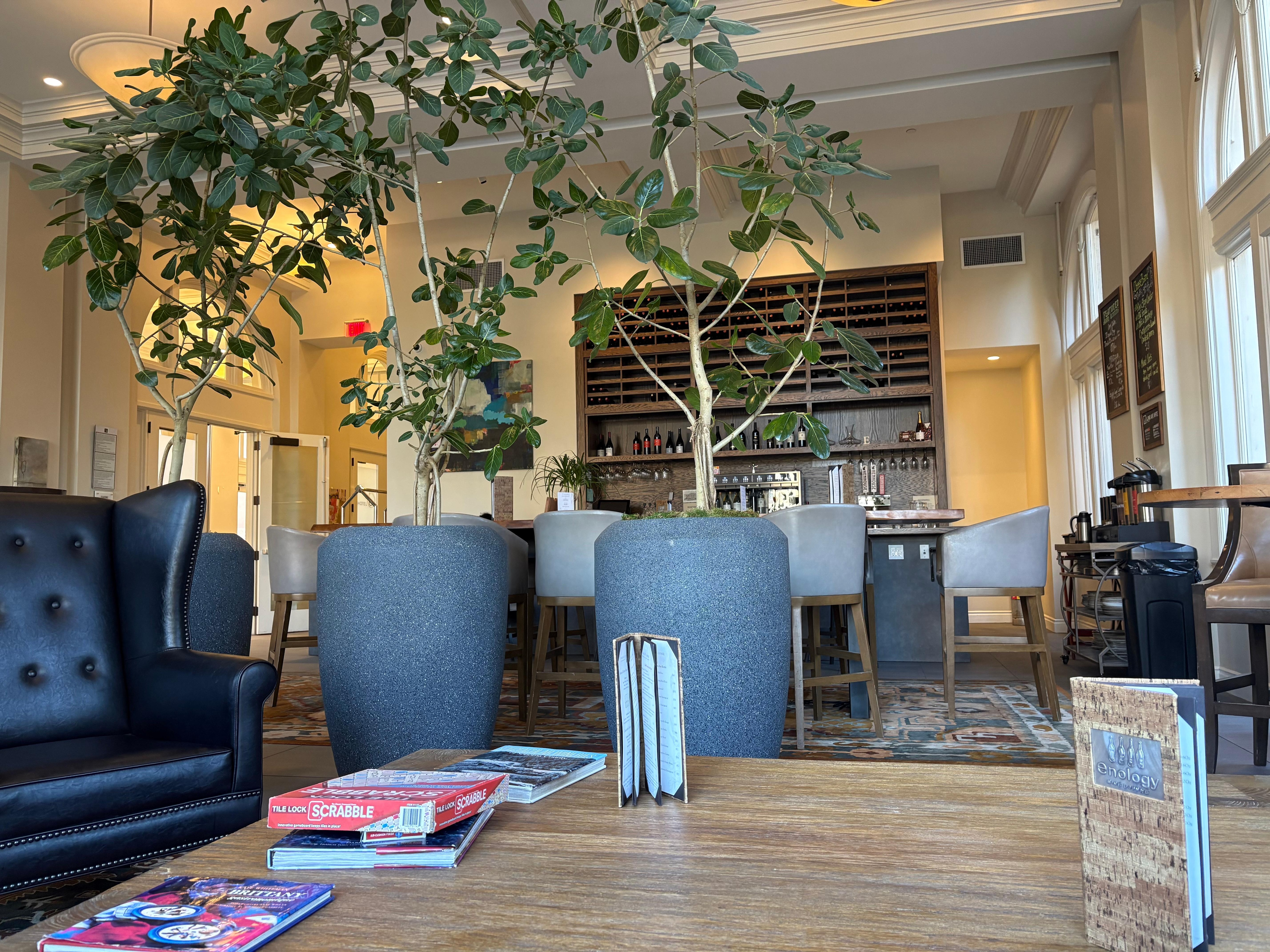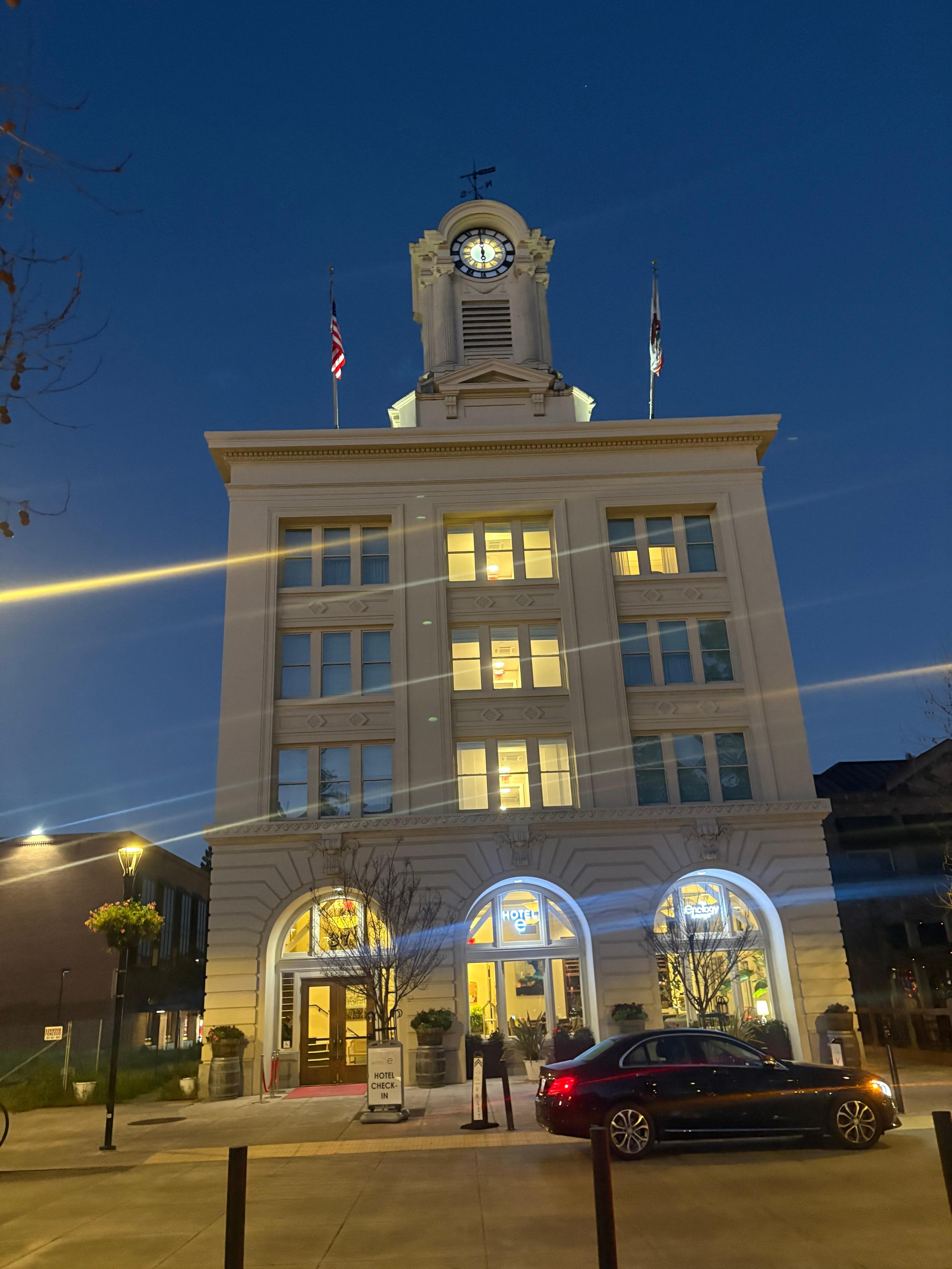 Beautiful historical building in the center of town. Lovely, welcoming lobby with a wine bar, gorgeous room flooding with natural light, close to all of the restaurants and shops downtown. A 10-min walk to Luther Burbank Gardens. Staff is super friendly—everyone! A nice little continental breakfast too.
