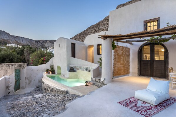 Taillées à flanc de falaise, les villas Canava peuvent accueillir jusqu'à 16 personnes dans un cadre naturellement frais où règnent les merveilles des rochers et des pierres des montagnes. Une combinaison de pierre et de bois. Avec des plafonds de 4,5 mètres de haut, des sols et des murs en béton poli, un décor multicolore vif, un hébergement sur le toit, un bassin profond à jets de 5 mètres avec un joyau de jacuzzi caché, un mobilier conçu sur mesure, une terrasse extérieure qui supervise la piscine et l'état de la situation. technologie de l'art, la propriété est vaste, unique et indéniablement chic. Avec un accès direct à la cour et à la terrasse, les villas offrent une vue sur la mer à Perivolos et au vieux village médiéval pittoresque d'Emporio.