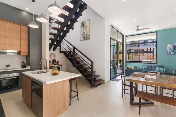 The modern kitchen is around the corner and features a bright, clean design with white stone countertops, wood cabinets, and contemporary pendant lights. The large kitchen island can seat three and includes a built-in sink, and the kitchen comes with brand-new stainless steel appliances, including a refrigerator, microwave, dishwasher, and stovetop. The home also comes with a toaster, a coffee maker, and dishware. There is also a half bathroom downstairs.