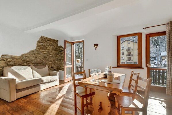 La décoration de la salle de séjour est simple mais très élégante. Il est doté de parquet, d\'un canapé et d\'un fauteuil confortables, d\'une télévision à écran plat et d\'un coffre à couvertures peint de style alpin. Deux portes vitrées mènent au petit balcon qui donne sur le jardin commun. La table à manger se trouve à côté de la cuisine ouverte. Celle-ci est équipée d\'une plaque de cuisson, d\'un four, d\'une cafetière Mokka et d\'un réfrigérateur/congélateur.