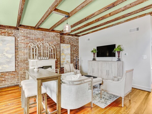 Step Inside One of the Most Luxurious Savannah Vacation Homes Exposed wooden beams, brick accent walls and pristinely aged hardwood floors make the main room in Gordon Inn Tree Top a show-stopping room to walk into upon your arrival. Get comfortable on inviting couches as you watch the mounted flat-panel television beside a sophisticated fireplace. Your beautiful kitchen is tucked right beside your main lounging area. This culinary space pampers you with a two-drawer refrigerator, slide-in stove, mounted microwave and coffee pot. Enjoy generous cabinet space, a sunny window and a vibrant backsplash in this modern, efficient kitchen that comes equipped with everything necessary to whip up your own meals. There's also a lovely table for enjoying meals at home.