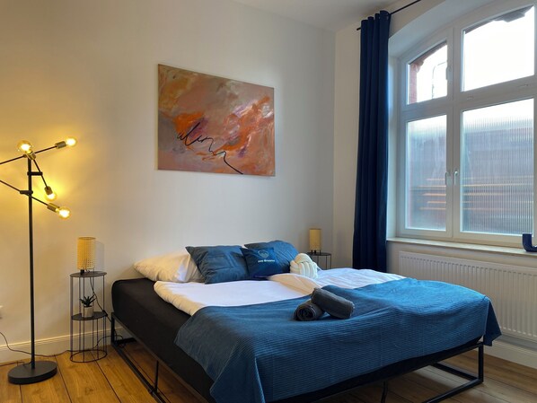 ✔️Directly next to Schwerin train station ✔️Ground floor ✔️88 sqm ✔️Self check-in from 3 PM - 10 PM ✔️1 king-size bed ✔️1 queen-size bed ✔️1 comfortable sofa bed ✔️1 narrow folding mattress for children or undemanding adults ✔️1 baby cot ✔️Workspace with Wi-Fi and desk ideal for working ✔️Fully equipped kitchen ✔️Senseo coffee maker & coffee pads ✔️Fresh sheets and towels ✔️Elevator available ✔️Projector & Smart TV, where guests can log in with their own Netflix account; perfect for romantic evenings after an extensive day of sightseeing for those seeking peace and quiet, couples & seniors ✔️Washing machine & dryer ✔️Bakeries, shops, and pharmacies in the immediate vicinity ✔️Many excursion destinations in the immediate vicinity -5 minutes to the Schlosspark-Center -10 minutes to Schwerin Castle, lake, cinema, and museums