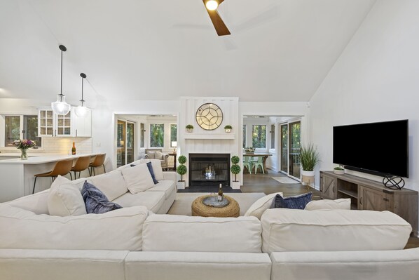 The open-floor plan of the main living space and kitchen is perfect for entertaining and spending time with friends and family. There is a gorgeous sun room with expansive windows that allows guests to take in the wooded views and helps to fill the home with natural light. It is a wonderful spot for playing board games or relaxing with a book. You'll also love relaxing on the comfortable sectional sofa in front of the large TV. There is a beautiful dining table with seating for eight as well as a few more bar stools at the kitchen counter. The newly upgraded kitchen has plenty of storage and prep space.