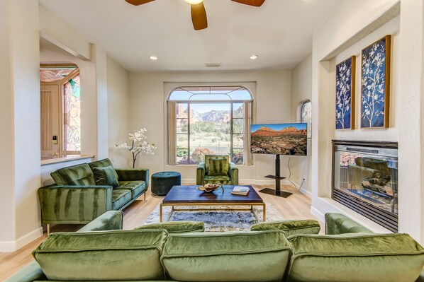 Living Room: The living room offers contemporary furnishings, a Smart TV, gas fireplace, and the picture window providing natural light and stunning views.