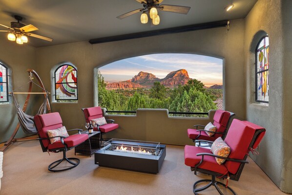 🔥 Eco-friendly bioethanol fire pit table, hammock chair swing and high-backed swivel chairs to fully enjoy the red rock views