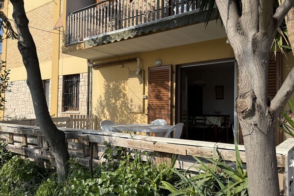 Private courtyard equipped with table and chairs.