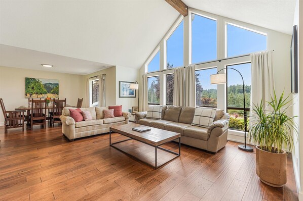 Step inside and feel the calm of wine country living. The spacious living room invites you to sink into the soft couch or loveseat and take in the sweeping vineyard views through large picture windows. A wood-burning fireplace anchors the space, creating a warm and welcoming atmosphere ideal for conversation and a glass of Beckham Estate wine before or after dinner. Each guest receives a complimentary tasting at the estate's nearby tasting room, a perfect way to begin your stay. For a quiet moment, slip into the smaller sitting area with another cozy fireplace, an inviting spot for reading, reflection, or a relaxed movie night. No matter where you choose to unwind, every corner of this home is designed for comfort and relaxation.