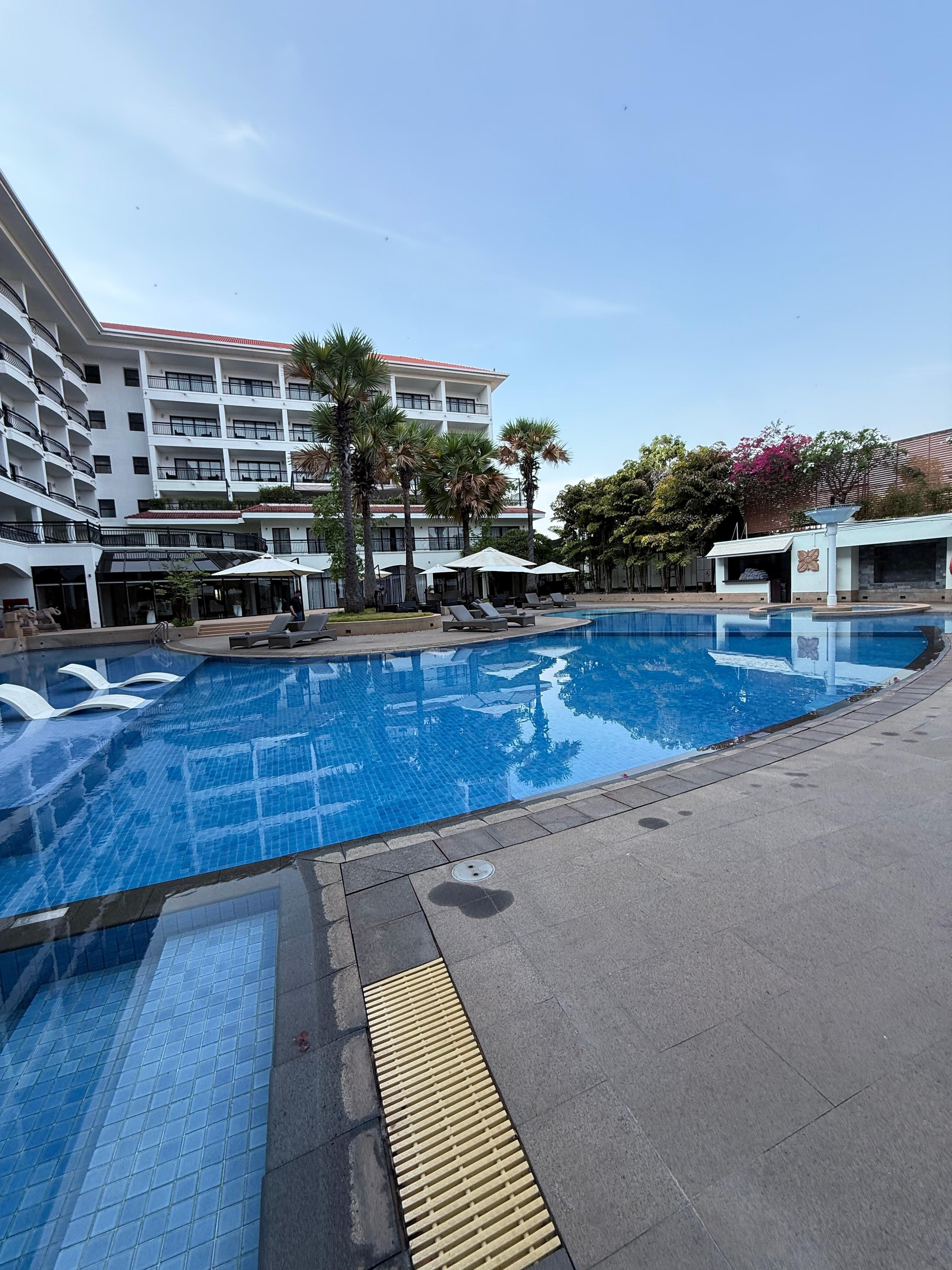 A sala de cafe é enorme, deliciosa, com imensa variedade de comidas do mundo inteiro. Piscina sensacional, com show tipico apsara em algumas noites. Tuk tuk na porta e barato. Os funcionarios prestativos e prontos sempre a ajudar.
