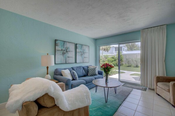 Beautifully UPDATED!! Let's see.....Private Beach....3 heated community swimming pools, one being near the beach, free covered parking, gas grills, outdoor shower...all.on Famous Siesta Key with it's white, cool, powdery sand.....build sandcastles, walk the beach to pick-up shells, play in the Gulf of Mexico.....it's all here waiting for you!You can see the glistening waters from the sidewalk just outside the back of the unit. Walk to put your toes in the sand in around a minute! The location of this resort is ideal as it rests on Siesta Key beach. It's also just a short 1.5 miles away from the heart of Siesta Key Village. Leave your car parked in the shade and take one of several free rides offered where you tip for appreciation. Visit the many great shops to purchase beach wear or high-end clothing. Walk down the sidewalk and scour for many great restaurants to choose from or grab a hot donut at our local Meaney's Mini Donut stand. If homemade ice cream or gelato is your thing, stop at Sub Zero Nitrogen Ice Cream or choose Big Olaf's Amish homemade fare. It's all at your fingertips if you stay in our villa at Jamaica Royale.Highlights: Walk to the Private beach, WiFi, Cable & Streaming, 3 Pools, Updated, King Master, Lanai, Beach Accessories, Private W/D in the villa, Covered Parking, ShuffleboardThis unit is in the single story section with covered parking in the front. Garden views from the living room & lanai.Come inside out villa it's truly delightful! The flooring is gorgeous wide plank wood tiles in grey. The kitchen is updated with lovely solid stone granite and oak cabinet with stainless steel appliances. The stainless side by side door refrigerator has convenient front door water/ice access, a stainless built-in microwave sits above the black and stainless glass top stove/oven. All dishes, glasses and basic appliances are provided. Extended granite counter with bar seating for 4 on comfortable cushioned-back stools. The gorgeous beach themed living room has a sofa sleeper, new draperies, new soft on your feet, blue fluffy rug and 2 new modern soft gray chairs just added Nov 2020. Plan movie night with the family on the large flat screen TV with Cable/WiFi included plus streaming is available....so get the popcorn popping! Sliders open out to the private lanai with garden views. Enjoy some wine and fruit in the shade under the umbrella.There are two bedrooms....take a walk down the hallway past the guest bathroom to the master King suite. Get a good night's sleep on the King bed with new blackout draperies. You have a small flat screen (cable) to watch your favorite night time show. Remote ceiling fan, gorgeous new wood tile flooring, ensuite bathroom with a tub/shower combo completes the modern retro master suite! Guest bedroom has two queen beds, two small closets and a dresser for all your belongings to be neatly put away if you wish. New blackout draperies cover the windows for a great night's sleep! No TV in the guest room. The guest bath is right outside the door and is basic with a small sink and step-to shower. Beach accessories are provided and stored in a container on the patio.This is a NON-SMOKING CONDO. If smoking on the back patio, please make sure all doors and windows to the condo are closed. Sorry, no pets allowed.A shower is available for Jamaica Royale guests as you re-enter the property from the beach. There are also water hoses provided by each Garden apartment to remove