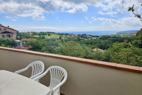 Description: First floor of a two-family building. Living area with kitchenette with electric hob and dining table - master bedroom with double bed and single bed - second bedroom with single bed - bathroom - large terrace equipped with table and chairs with breathtaking sea view - private and reserved parking space.