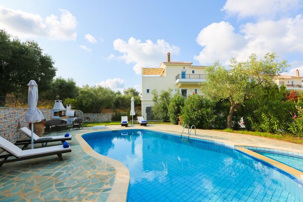 Villa Selini is amazing and is set on a hillside with lovely views across Skiathos. Its spacious and clean with a well stocked kitchen and lots of storage space in the bedrooms most importantly fabulous air conditioning which is a must after a day at the beach! There are lovely open balconies off all the bedrooms and also on the top floor off the living room and kitchen. For us the villa was positioned perfectly and we enjoyed walking down hill to collect the car every morning often stopping off at Ariston bakery which sold amazing fresh pastries cakes and sandwiches! Bus stop 1 is just at the bottom of the hill should you wish to jump on to visit one of the lovely beaches further round the island! We did attempt to walk up the hill once - the walk up is definitely doable just not on the middle of the day! Once down the hill you are virtually 5 minutes away from the port and within a couple of minutes of a lovely fresh fruit and veg store and a well stocked supermarket The pool at the Villa is fantastic and big enough for all 10 of us to enjoy cooling off with a swim. We also used the downstairs apartment which gave extra space and facilities which was an added bonus! Any question we had or advice we needed was responded to within minutes Eleni was able to help us arrange a private boat trip around the island which was fabulous! We all had a fantastic time and will be back for sure!