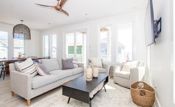 Get away from it all at this 5 bedroom, 4 bath new construction home in North Topsail Beach. The popular reverse floorplan on this oceanside B-lot home puts all the living space on the top floor, where views of the Atlantic Ocean and Intercoastal Waterway can be found from the multiple covered porches. The modern minimalist decor will have you relaxing without the clutter of daily life. Don't miss the custom seating on the private beach access walkway, to sit and take in the morning sunrise with your coffee.