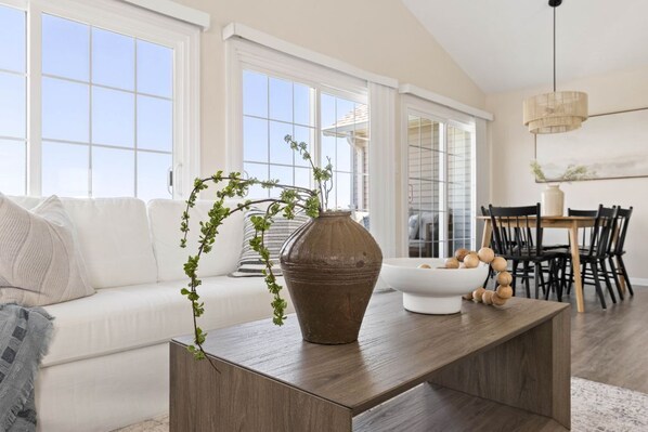 Cook like a chef in the fully stocked kitchen, featuring modern appliances, generous counter space, and a Keurig Duo for both pods and drip coffee. Share meals in the adjacent dining area or dine on the deck as you watch the gorgeous sunsets!