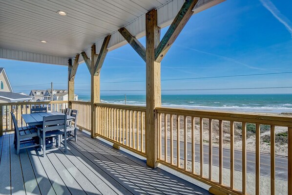 Featured on the hit TV show House Hunters, Beachfront Memories is your next escape to paradise! Enjoy a beautifully decorated living room with amazing top-level views of the ocean and waterway. New landscaping includes a putting green and fire pit. There's plenty of comfortable seating—perfect for relaxing, movie nights, or cozy conversations. The fully equipped kitchen has everything you need for cooking, and the large dining room table provides ample space for meals, snacks, or game nights. A propane grill is also available for oceanside cookouts and grilling the day’s fresh catch.