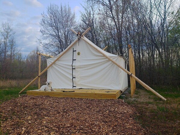 While glamping in Michigan, guests will have a private, fully-furnished safari tent and the shared bathroom and shower facility is just a short walk away. The bathroom was remodeled in 2022 and is cleaned regularly to provide a safe and comfortable experience for guests.
