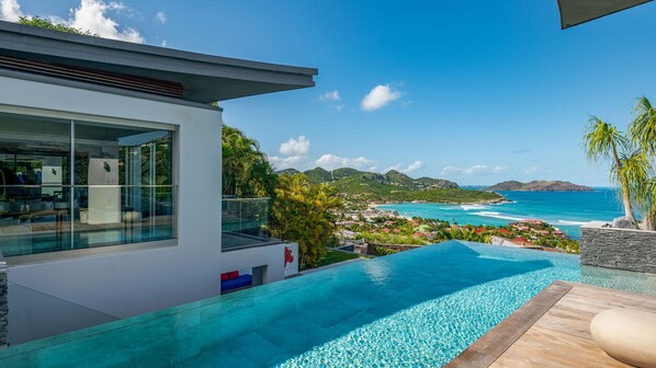 Beautiful lap infinity heated pool 3 x 10 m that overflows onto a little pool with bench in front of the bedroom 4, sun deck, Outside shower.