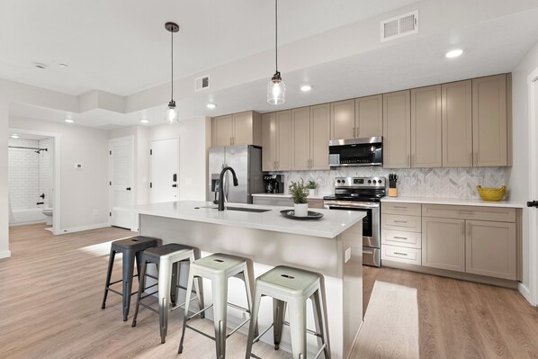 The open-concept living area is bright and inviting, with tasteful décor and all the amenities you need to feel at home. Stream your favorite shows on YouTube TV, or relax and unwind after a day of exploring.