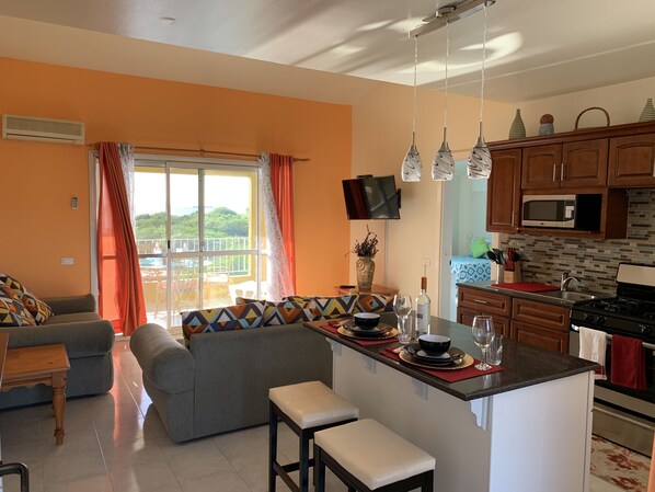 Effortless check in, all was as expected. Spacious and comfortable apartment but a little over priced for what it is. Great location but would recommend a car if you want to explore the island, mind the potholes and dont park under trees..No communal pool, but the sea is great. Go to 1st choice to get any food items, you do tend to get riped off using the local shops, no prices and they charge what they want. Siboney hotel had a great restaurant, right next door to Marina Bay and entertainment several times a week, we plotted up there most nights. The beach is lovely and can be accessed easily from behind the apartment.