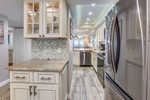 Cette unité a été totalement rénovée avec une nouvelle cuisine et des appareils ménagers, des salles de bains rénovées, un nouveau revêtement de sol et de nouveaux meubles! Il est situé au dernier étage de ce condo devant le golfe est l'endroit idéal pour vos vacances à la plage. Il a tout le confort de la maison plus une vue d'un million de dollars! Le balcon privé donnant sur la plage et le golfe du Mexique est un endroit idéal pour regarder le magnifique coucher de soleil sur la Floride. La chambre principale a une porte donnant sur le balcon et une grande fenêtre donnant sur le golfe. Après une journée passée sur la plage, laissez le bruit des vagues vous endormir. Les autres commodités incluent une laveuse et une sécheuse, une télévision à écran plat dans le salon ainsi que dans les deux chambres et un service Internet sans fil.