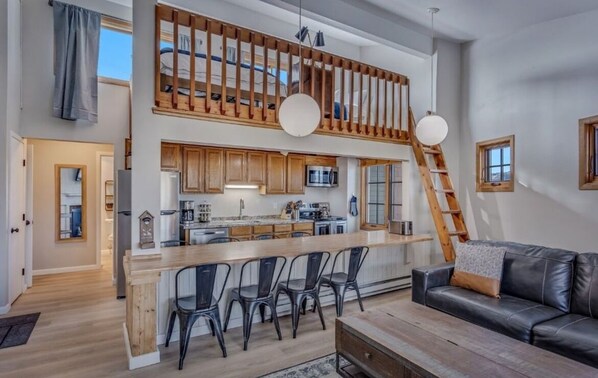 This cozy condo offers the perfect blend of comfort and convenience for your mountain getaway. Step inside to find ample storage space, ensuring you can unpack and settle in with ease. The comfortable living room features an electric fireplace, creating a warm and inviting atmosphere to relax after a day of adventure.